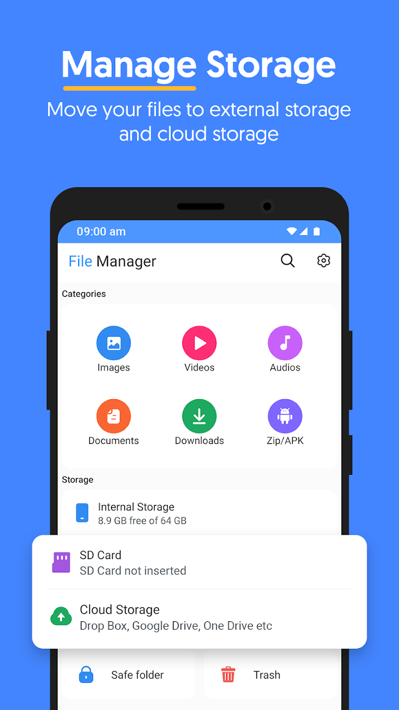 With Manage Files All in One, you can easily navigate through your device's storage and external SD cards, making it a breeze to locate and manage with files app. The intuitive File Explorer interface allows you to search, and sort files effortlessly, ensuring that you can find what you need in seconds.